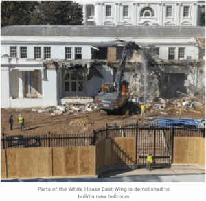 Note that Trump brought in cranes to demolish the East Wing just after the NO KINGS protests. Maybe he thought nobody would notice, that he could sneak this past us. Kinda hard to miss that kind of destruction, though. It like – yes, it’s very much like the destruction he’s doing to the Rose Garden and to the Constitution.