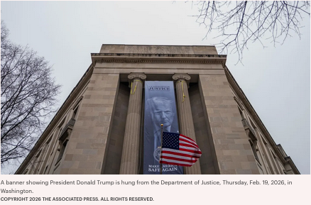 Banner with Trump’s face hanging on the Department of Justice Building. It reads, “Make America Safe Again.”